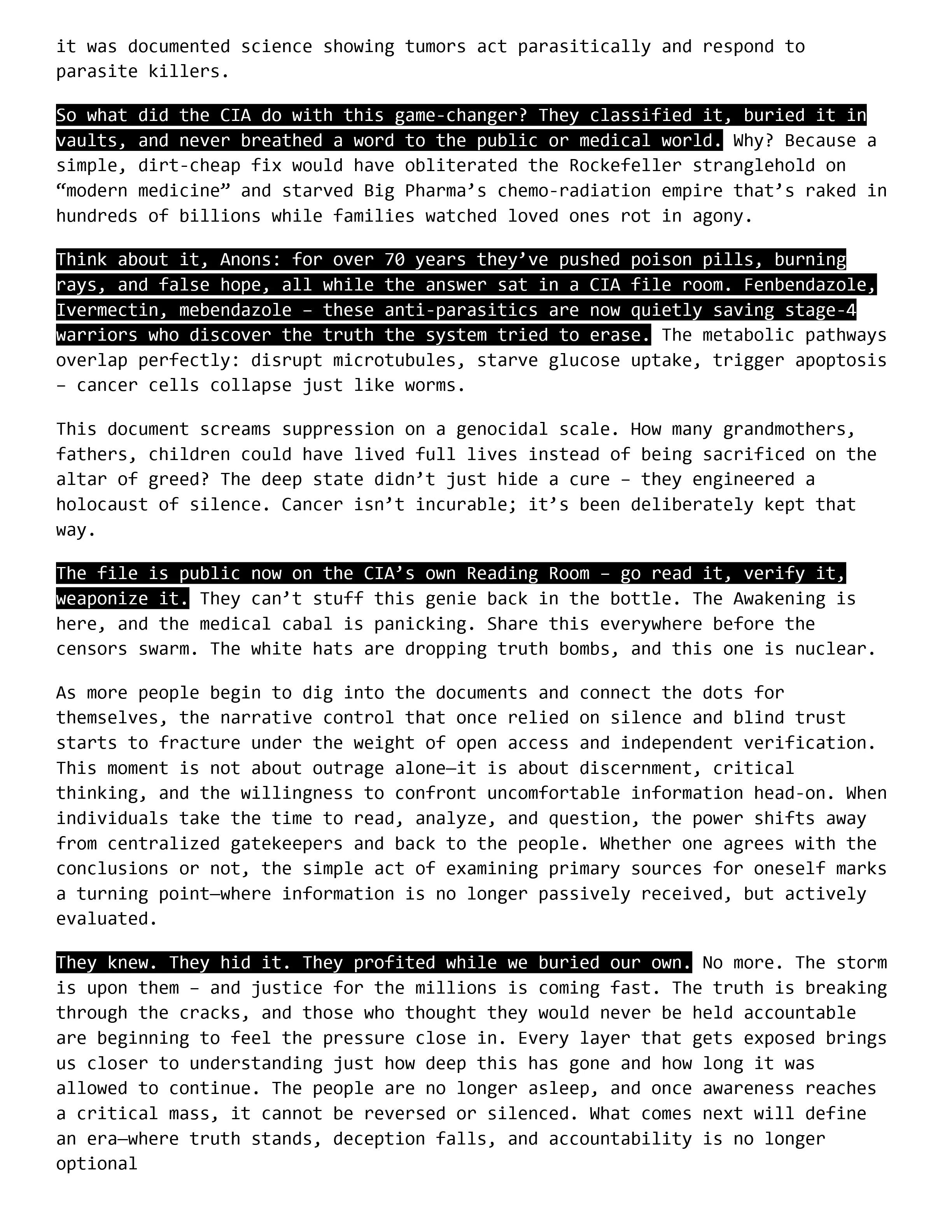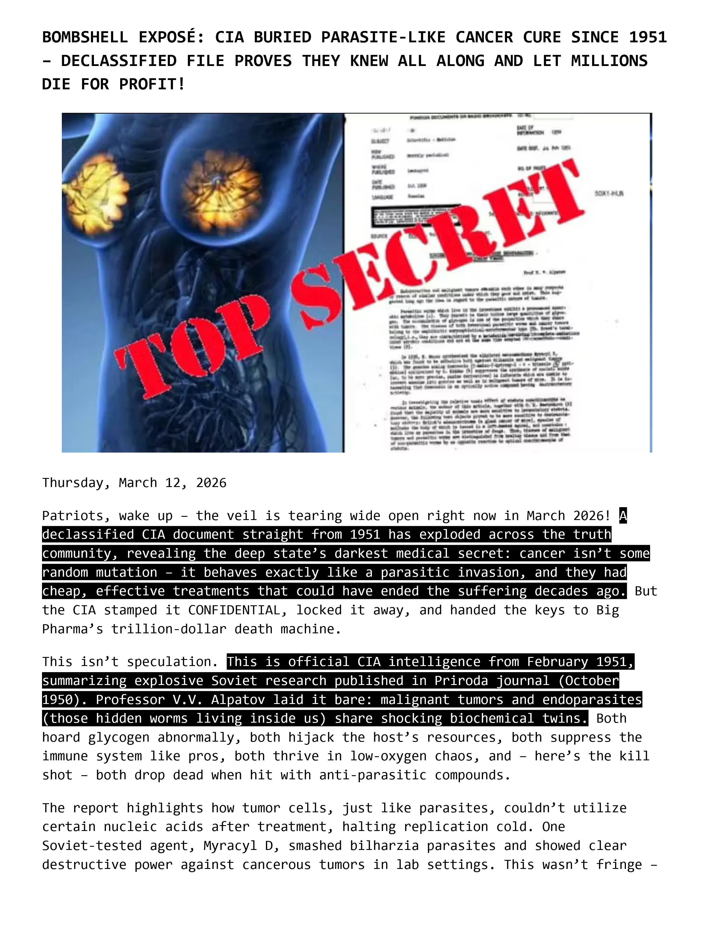BOMBSHELL EXPOSÉ: CIA BURIED PARASITE-LIKE CANCER CURE SINCE 1951 – DECLASSIFIED FILE PROVES THEY KNEW ALL ALONG AND LET MILLIONS DIE FOR PROFIT!