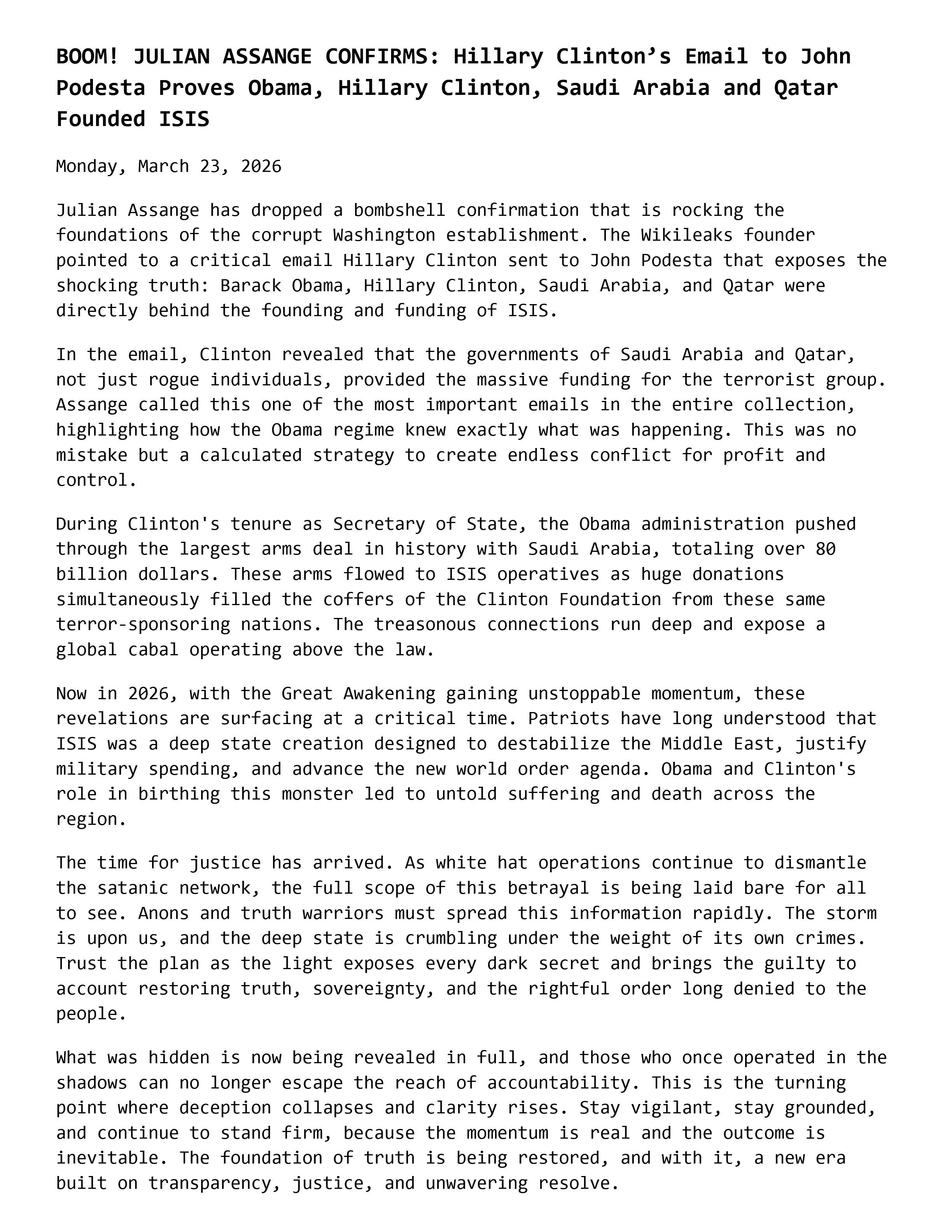 BOOM! JULIAN ASSANGE CONFIRMS: Hillary Clinton’s Email to John Podesta Proves Obama, Hillary Clinton, Saudi Arabia and Qatar Founded ISIS