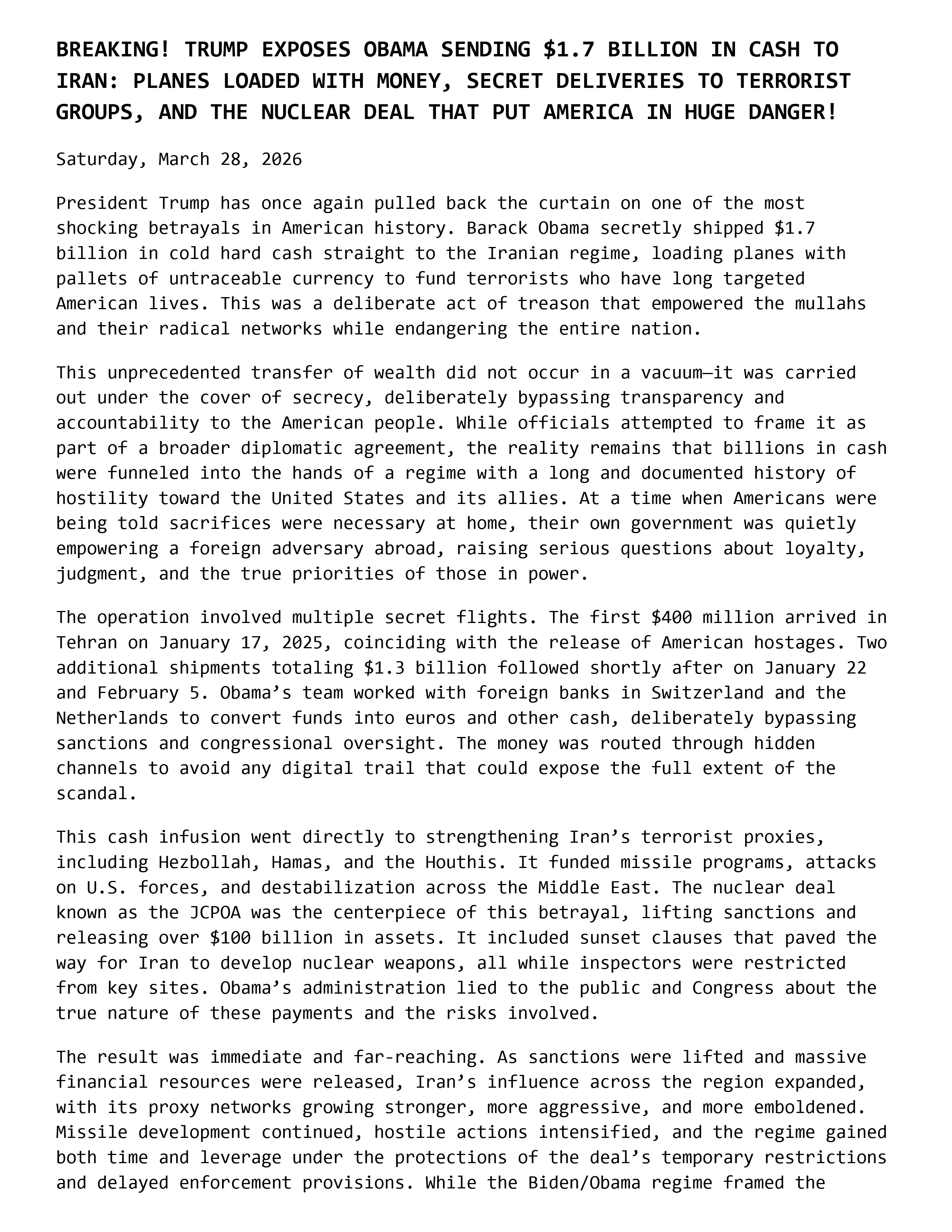 BREAKING! TRUMP EXPOSES OBAMA SENDING $1.7 BILLION IN CASH TO IRAN: PLANES LOADED WITH MONEY, SECRET DELIVERIES TO TERRORIST GROUPS, AND THE NUCLEAR DEAL THAT PUT AMERICA IN HUGE DANGER!