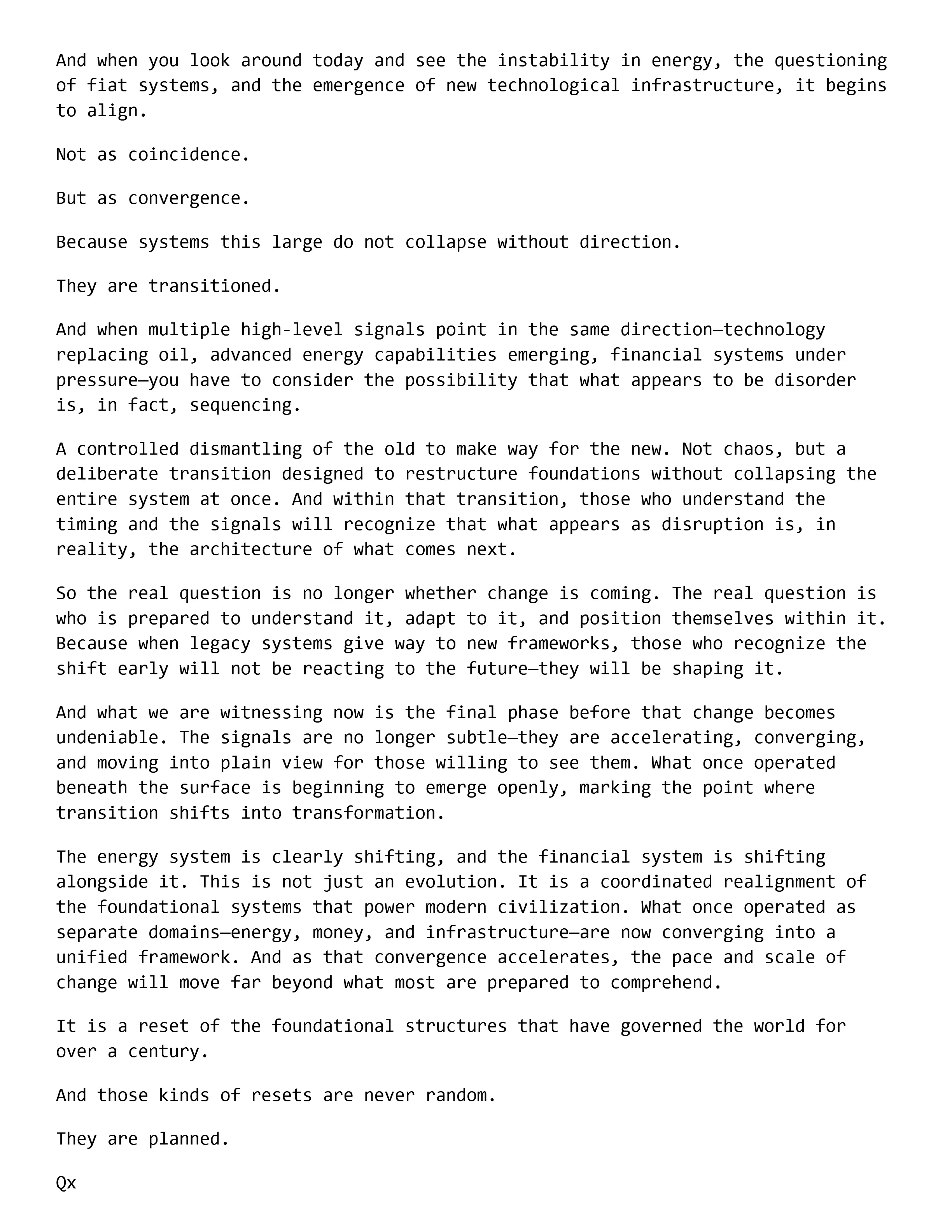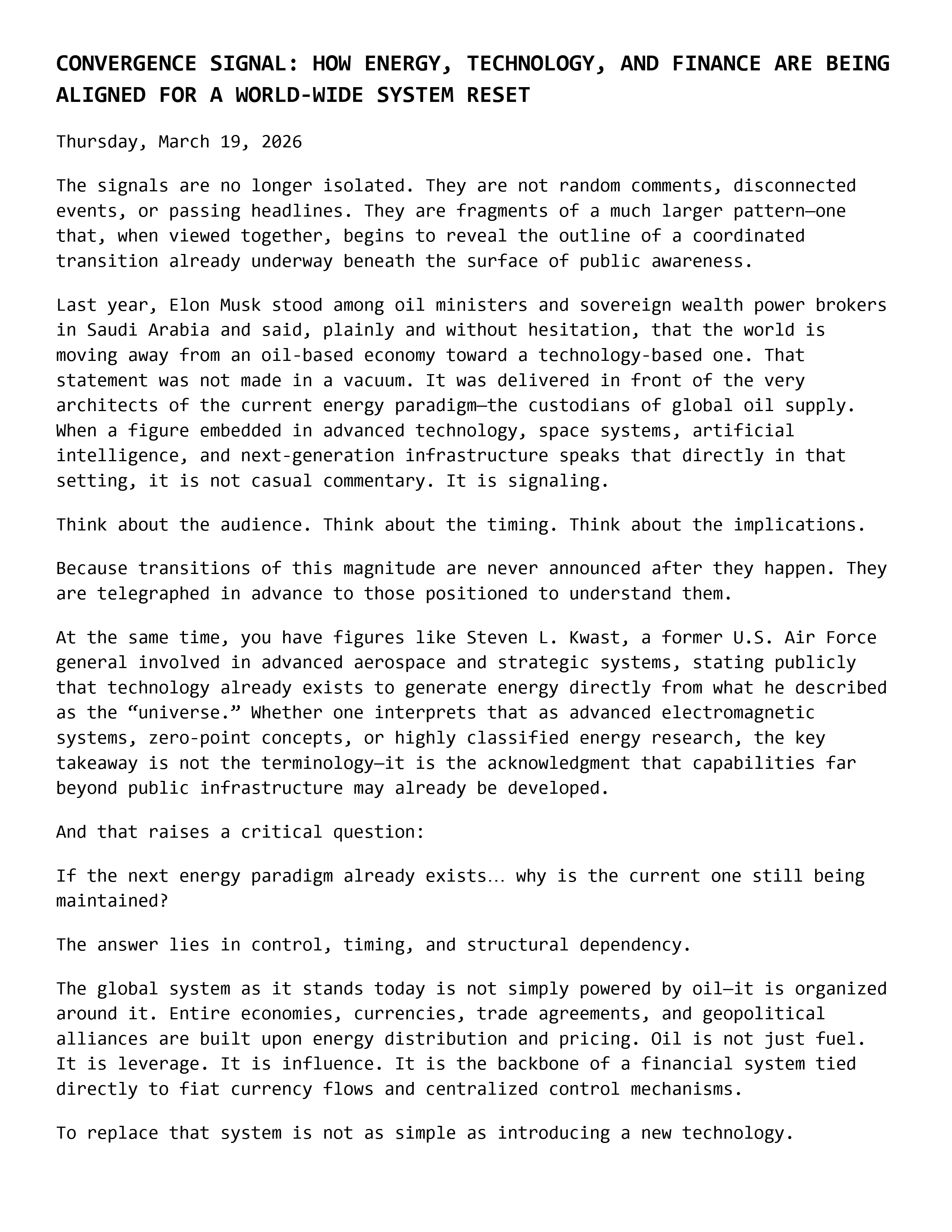 CONVERGENCE SIGNAL: HOW ENERGY, TECHNOLOGY, AND FINANCE ARE BEING ALIGNED FOR A WORLD-WIDE SYSTEM RESET