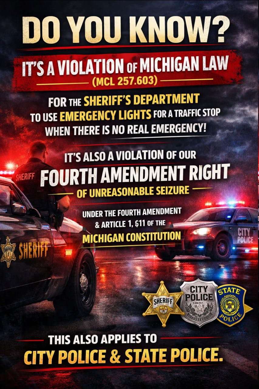 Despite these clear statutory and constitutional limitations, law enforcement agencies continue to employ emergency lights and sirens in violation of MCL 257.603 and Article 1, §11 of the Michigan Constitution. This practice persists largely because far too many people are not adequately informed or educated about their rights or the lawful boundaries governing police authority. Constitutional protections do not erode through repetition or convenience, and unlawful practices do not become lawful simply because they are widespread or uncontested. An informed public is essential to preserving the rule of law and preventing the normalization of unconstitutional conduct.