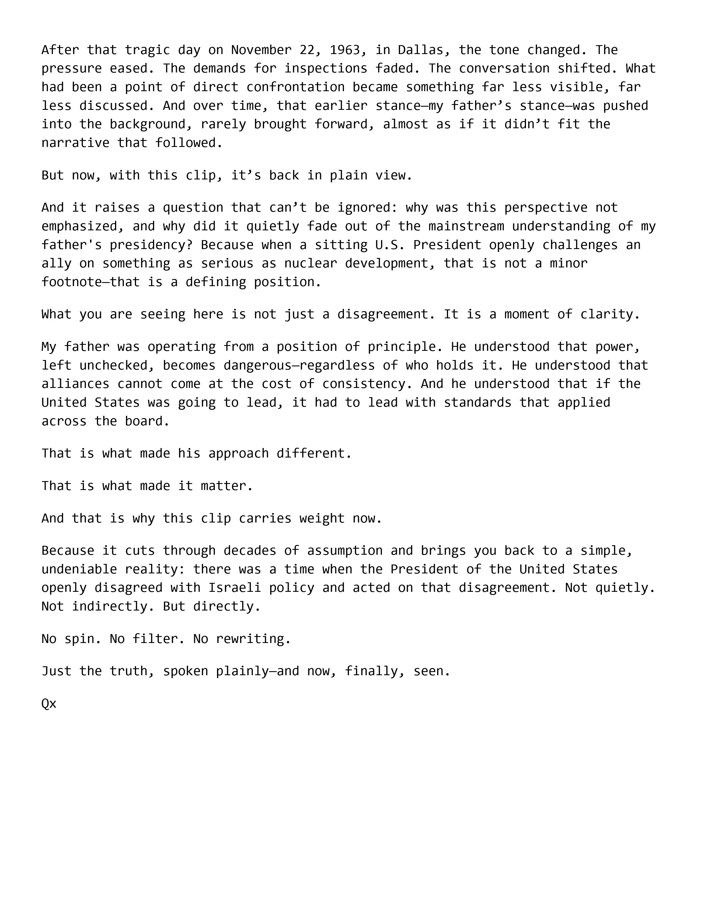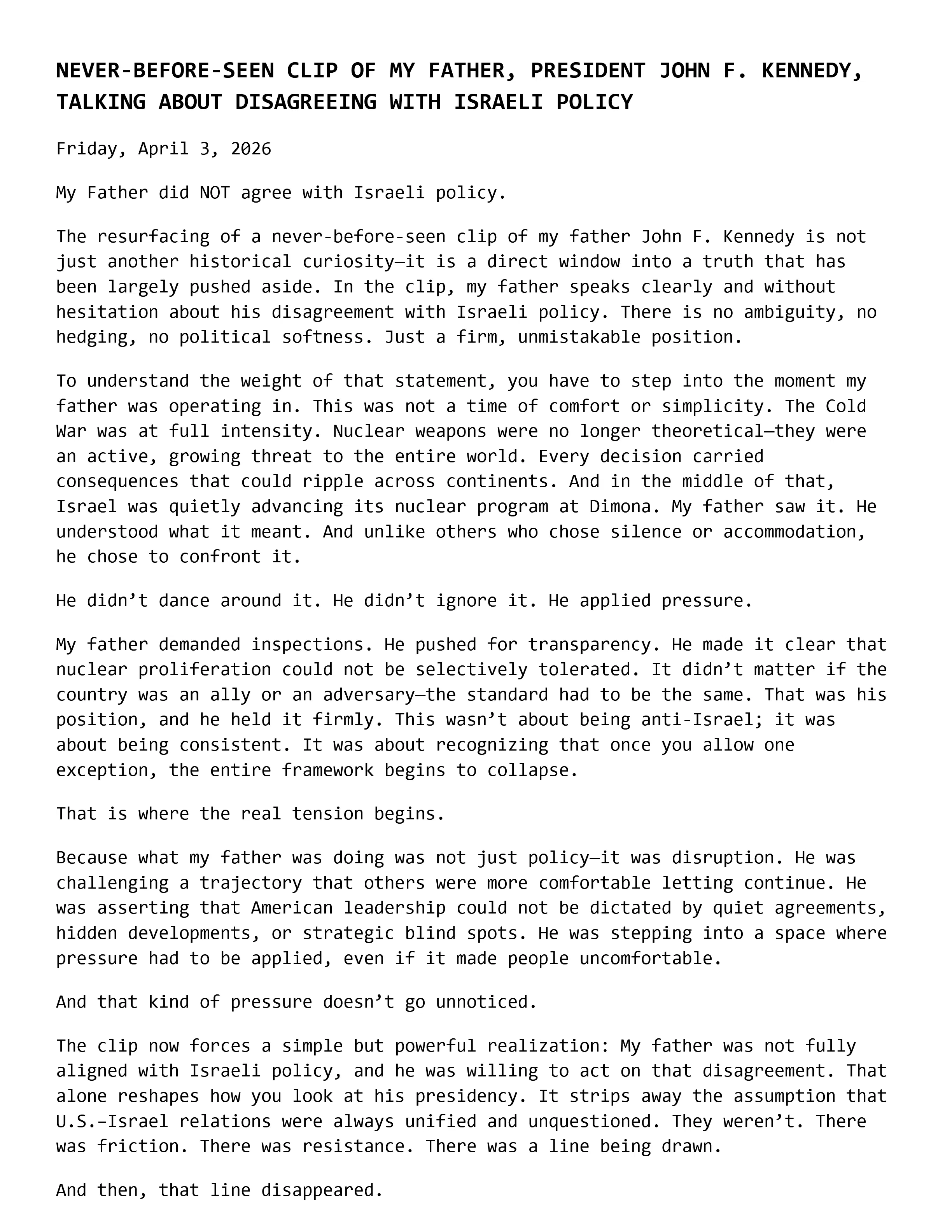 NEVER-BEFORE-SEEN CLIP OF MY FATHER, PRESIDENT JOHN F. KENNEDY, TALKING ABOUT DISAGREEING WITH ISRAELI POLICY