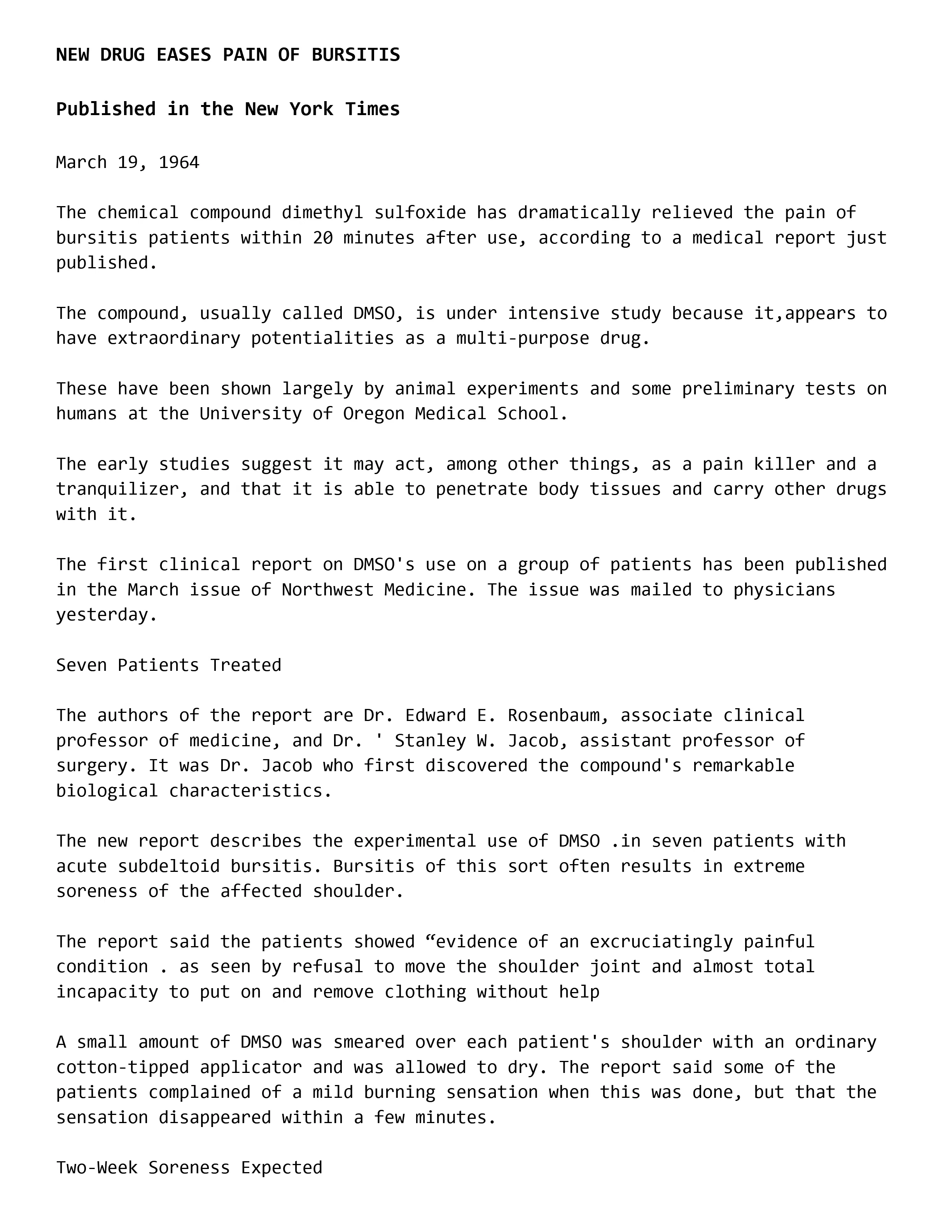 NEW DRUG EASES PAIN OF BURSITIS - THE PERSECUTED DRUG THE STORY OF DMSO