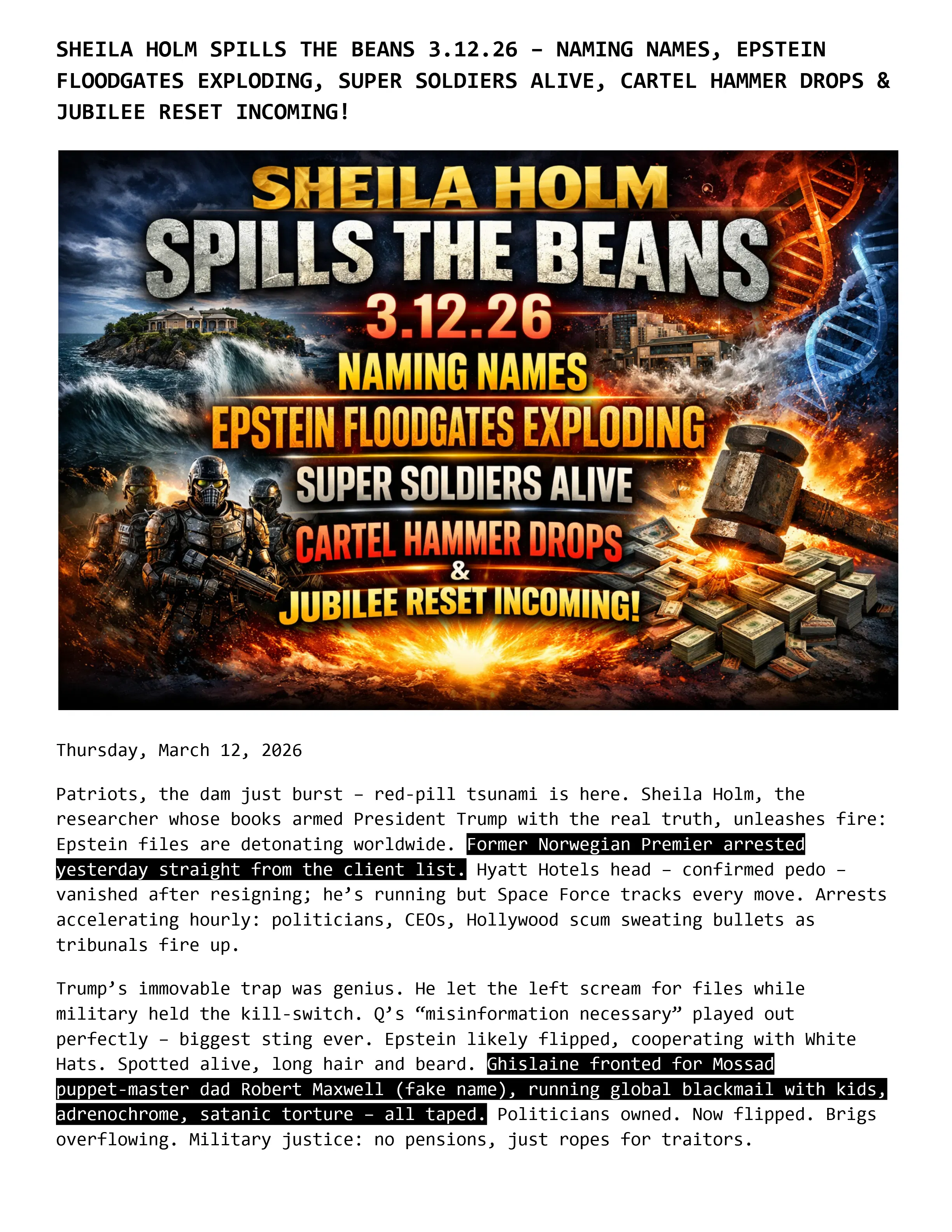 Sheila Holm Spills the Beans 3.12.26 โ Naming Names, Epstein Floodgates Exploding, Super Soldiers Alive, Cartel Hammer Drops & Jubilee Reset Incoming!