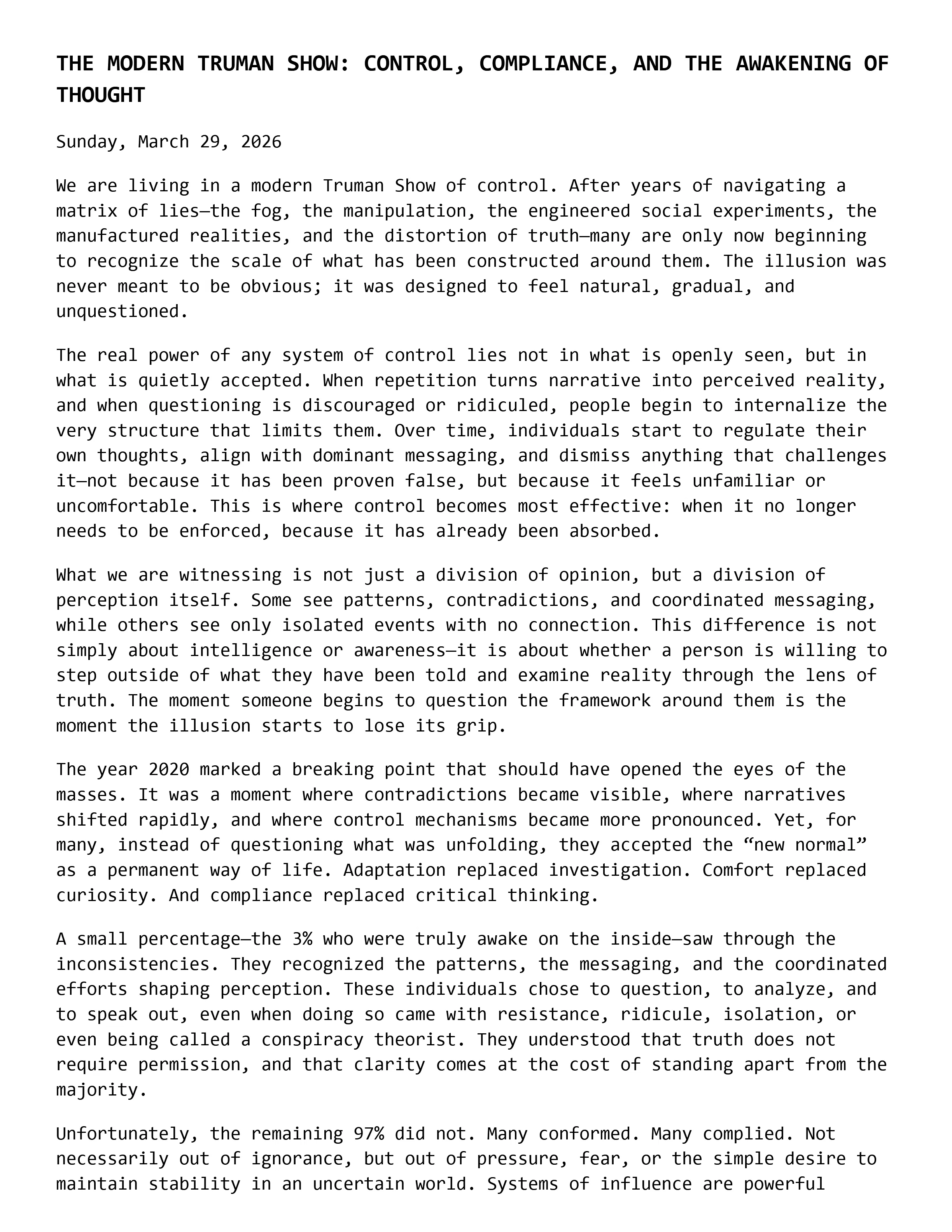 THE MODERN TRUMAN SHOW: CONTROL, COMPLIANCE, AND THE AWAKENING OF THOUGHT