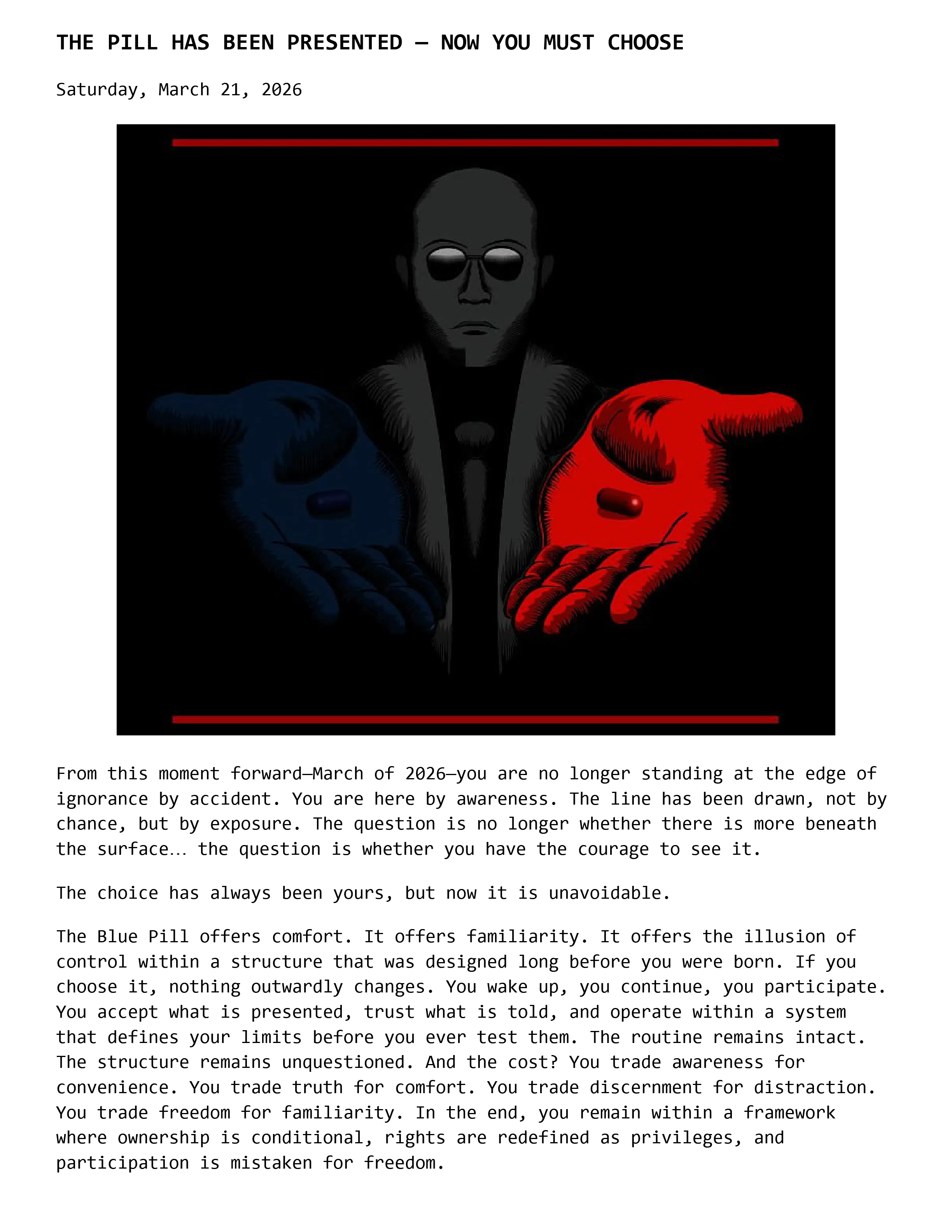 THE PILL HAS BEEN PRESENTED โ€” NOW YOU MUST CHOOSE