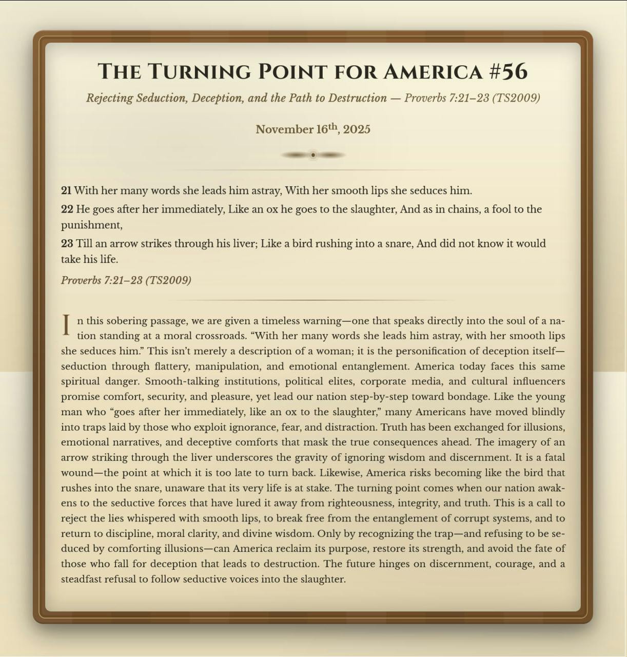 The Turning Point for America #56: Rejecting Seduction, Deception, and the Path to Destruction - Proverbs 7:21β23 TS2009