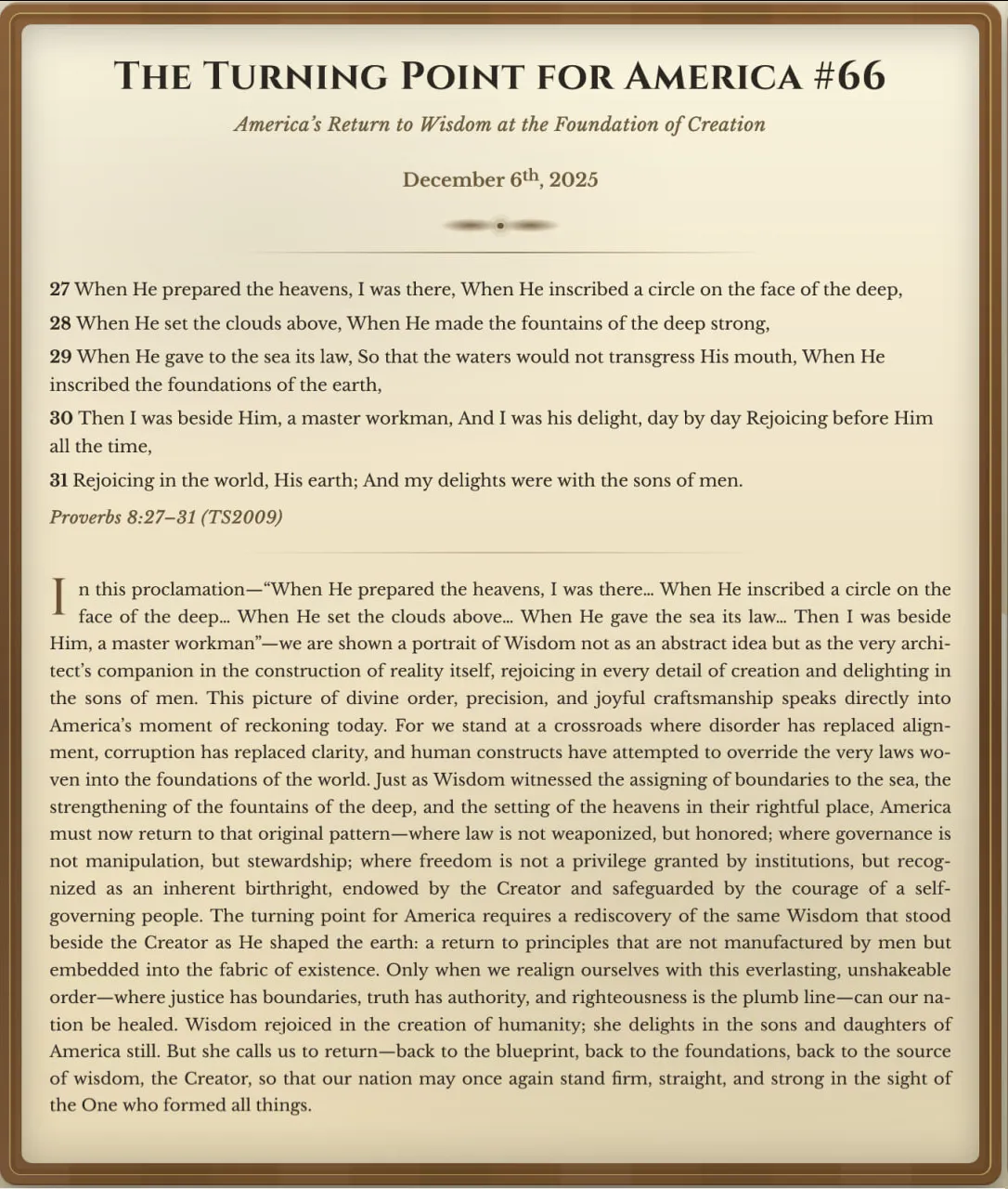 The Turning Point for America #66: America’s Return to Wisdom at the Foundation of Creation - Proverbs 8:27–31 TS2009