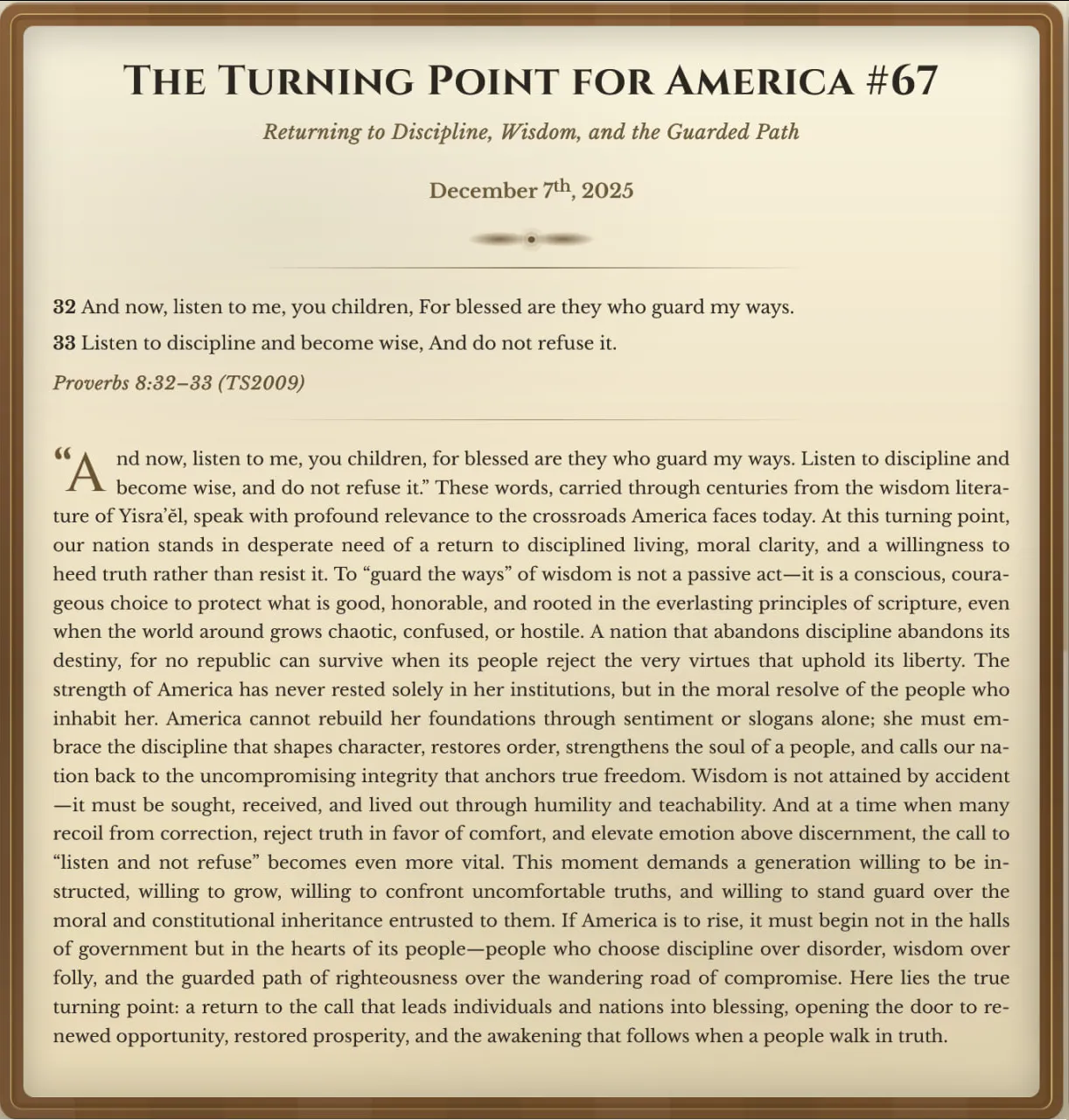 The Turning Point for America #67: Returning to Discipline, Wisdom, and the Guarded Path - Proverbs 8:32β33 TS2009