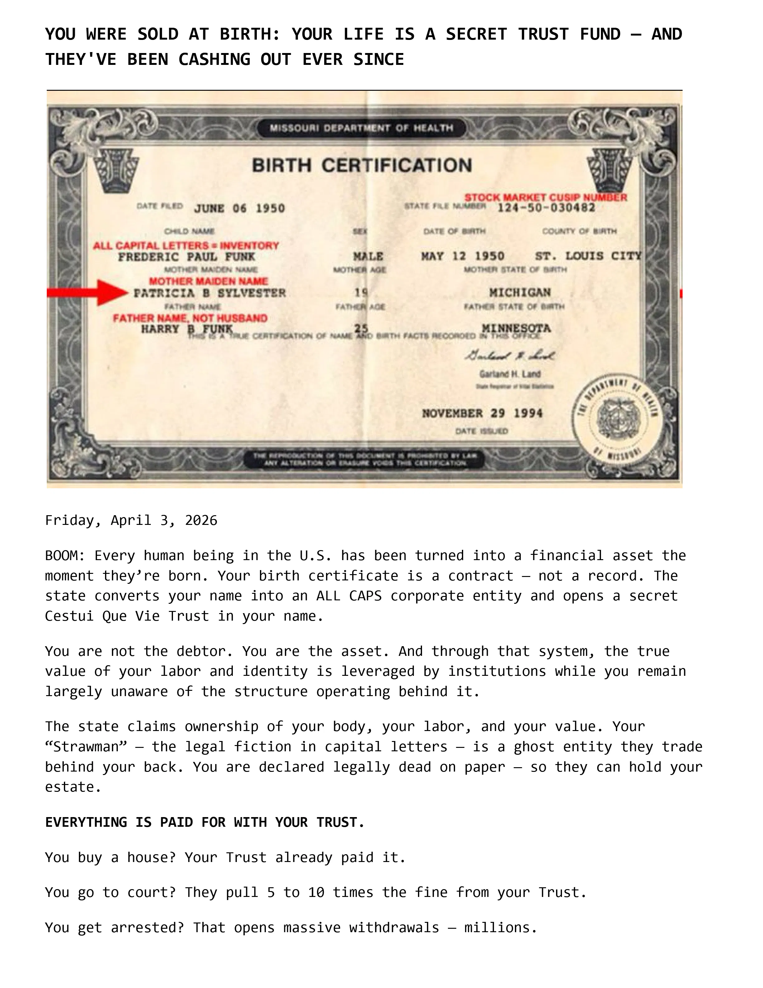 YOU WERE SOLD AT BIRTH: YOUR LIFE IS A SECRET TRUST FUND โ AND THEY'VE BEEN CASHING OUT EVER SINCE